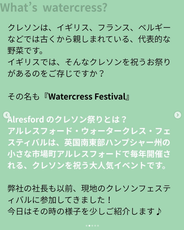 弊社の社長も以前、現地へ視察に行ってきたことがある大興奮のイベント。今回は、本場イギリスのクレソン愛あふれるお祭りの様子を少しだけご紹介します♪