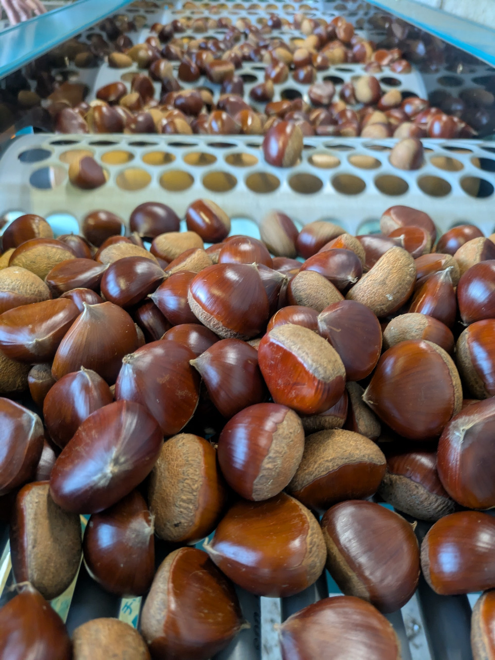 できるだけ見た目の粒揃えるため選果機導入しました。設備にお金かけてます!栗も品種によって形も様々。丸い、三角、横長…落ち方も様々…