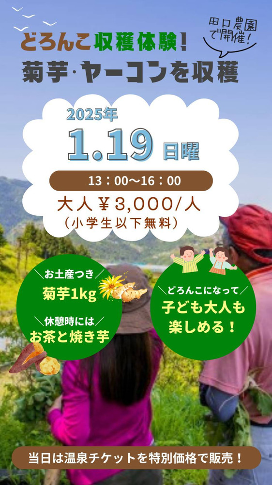 甘アマあまの焼き芋体験付き、お土産の菊芋や野菜直売も準備しております。小学生以下は無料ですので親子でお得なセット企画です。