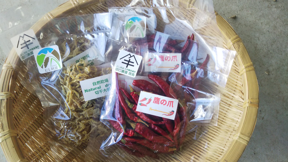 夏の間、世界農業遺産 にし阿波の傾斜地で育てた唐辛子を秋に収穫し、天日乾燥したものです。