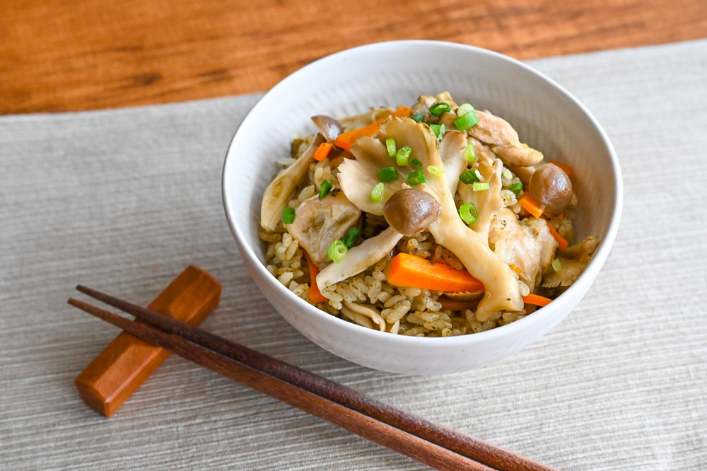 オリーブパウダーのほろ苦さと、出汁の風味の相性の良さを楽しめる炊き込みごはんです。お好みの野菜でアレンジもお楽しみいただけます◎