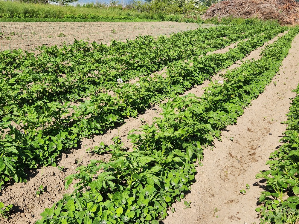 じゃがいもがきれいなお花を咲かせてくれました。夏頃には一斉に収穫となります。