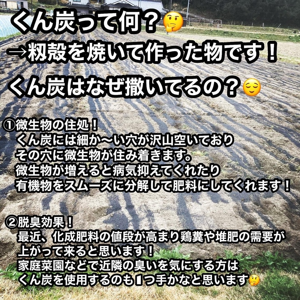 くん炭(くんたん)は籾殻を焼いて炭化させた土壌改良資材です👏