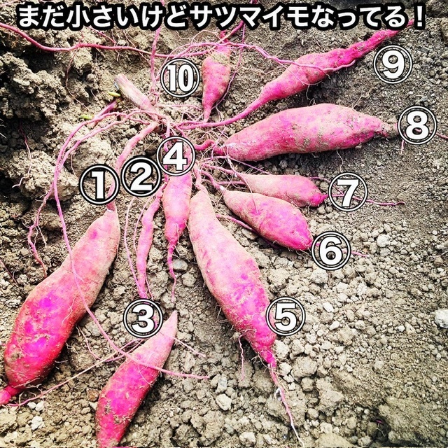掘ってみると小さいお芋も合わせて1つの苗から8〜10本のお芋が付いてました✨