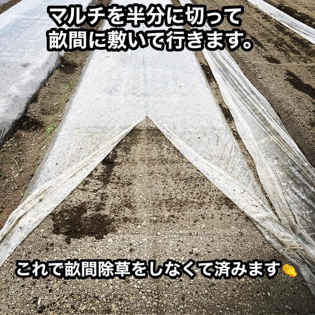普通は太陽熱マルチ後は剥がしてしまうんですが、それを真ん中で半分に切って畝間に敷きます。