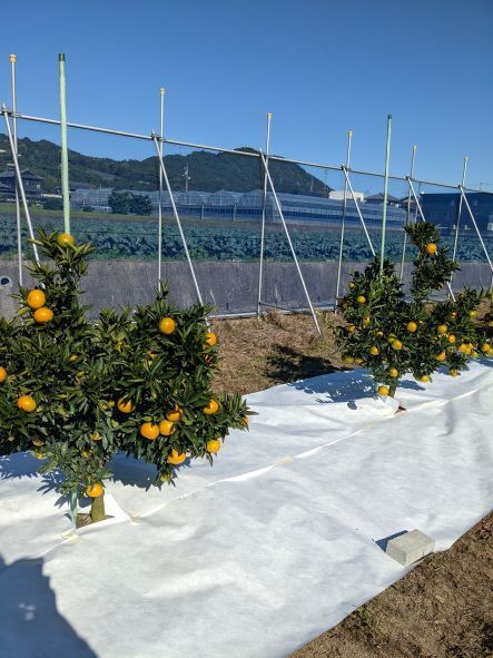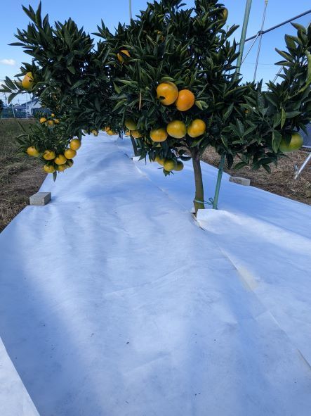 今年からの準主力品種「せとか」に防水・光反射タイベックスシートを5年生樹14本の株元に施設しました。