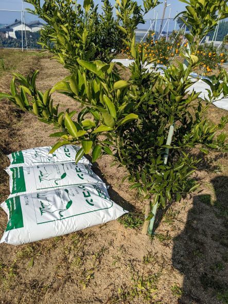 来年度期待の新品種「津之輝※片方の親のアンコールの良い香りを引継ぎ赤味が強く大きな果実の甘いミカンです」の3年生苗(今年初結果で全摘果)に来年度大きくて甘いミカンを沢山実ってもらえるように有機質をたっぷり含んだ牛堆肥を与えました。