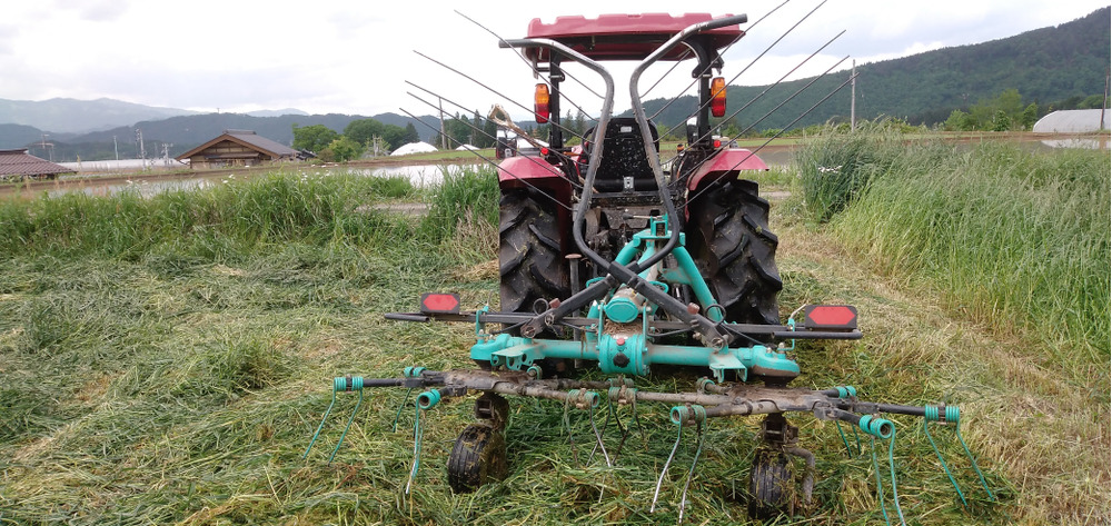 草刈りした後、トラクターにテツダーをつけて草を反転します。1日2回反転して2日ほど続けます。テツダーは草の軸を折り乾燥をうながします。#飛騨牛さんのまんま
