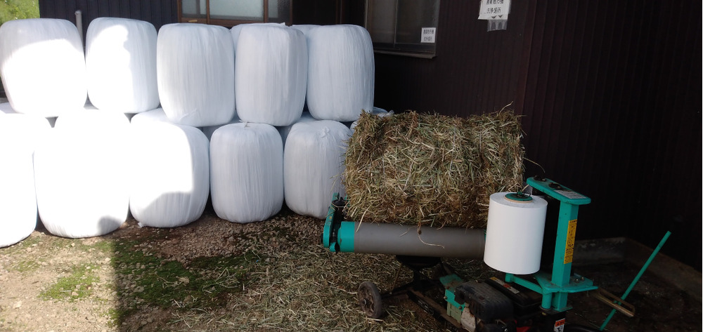 飛騨高山久しぶりの晴天なり!テツダーで畝を作りロールベーラーで草を書き込み円柱状の物を作りラッピングして乾草と漬け物の間くらいえさを作りました。天気が続きよかった。 #飛騨牛のまんま