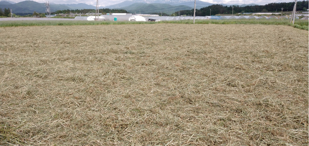 イタリアンと言う牧草を2日テツダーでまぜました。青色から枯れ草色に変身!スーと匂いを嗅ぐと青臭さから乾草の甘くいい匂い!喜んでくれるかな~我が社の腹ペコ社員!(^^) #飛騨牛さんのまんま