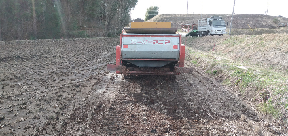 日に日に日差しが強くなり気温も上がってきたので遅れている田んぼの仕事を始めました、夏から6カ月間切り返した飛騨牛の完熟堆肥をマニアスプレッターとゆう機械で田んぼに均等に堆肥をまいていきます。この堆肥で土作りをして化学肥料ゼロの有機肥料100%の「飛騨う米」を作っていきます。😁
