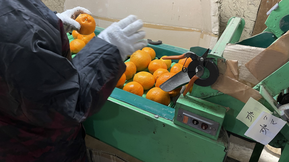 選果をして、傷物やまだ青い物を取り除き、大きさを分けていきます。