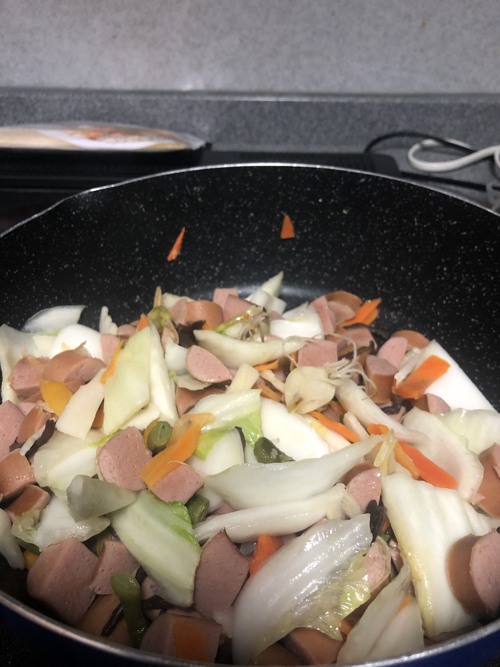 色とりどりの野菜炒めにカットしたにんにくが入ってます(^^)美味しく免疫力アップ!!
