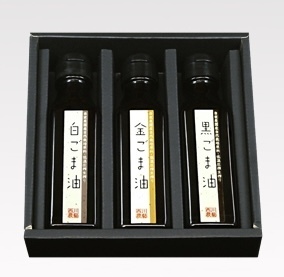 ギフトボックスに白・黒・金のごま油を2本または3本詰めたごま油詰合せの価格を改定いたします。
