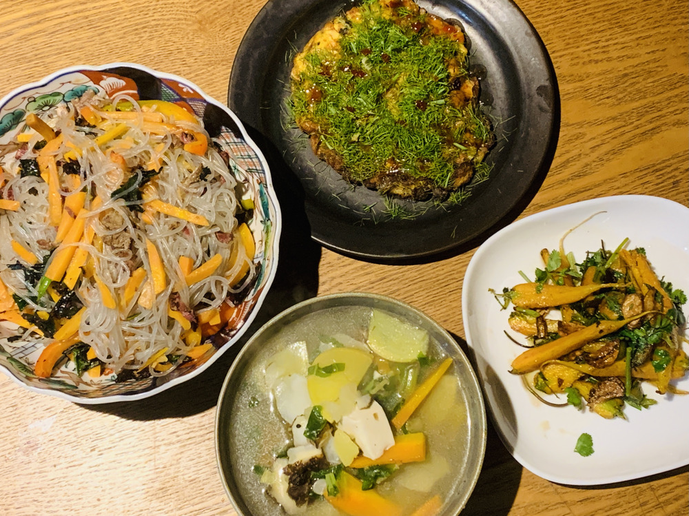 一番下は、色々根菜類のまろやか中華スープ。人参、かぶ、大根、菊芋を薄切りにすることで、あっという間に火が通って、すぐできます。菊芋を入れることで、全体にとろみが出て優しい味に。