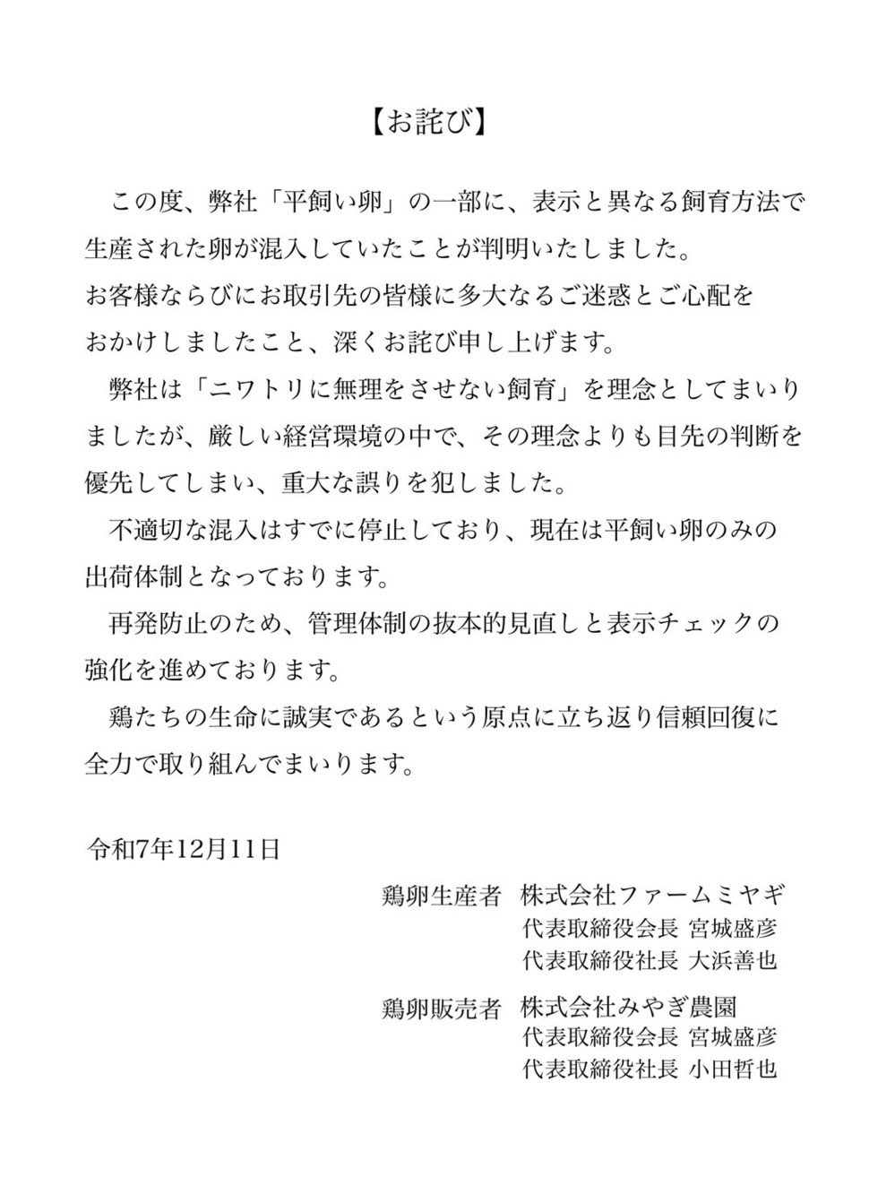 不適切な混入はすでに停止しており、現在は平飼い卵のみの出荷体制となっております。再発防止のため、管理体制の抜本的見直しと表示チェックの強化を進めております。