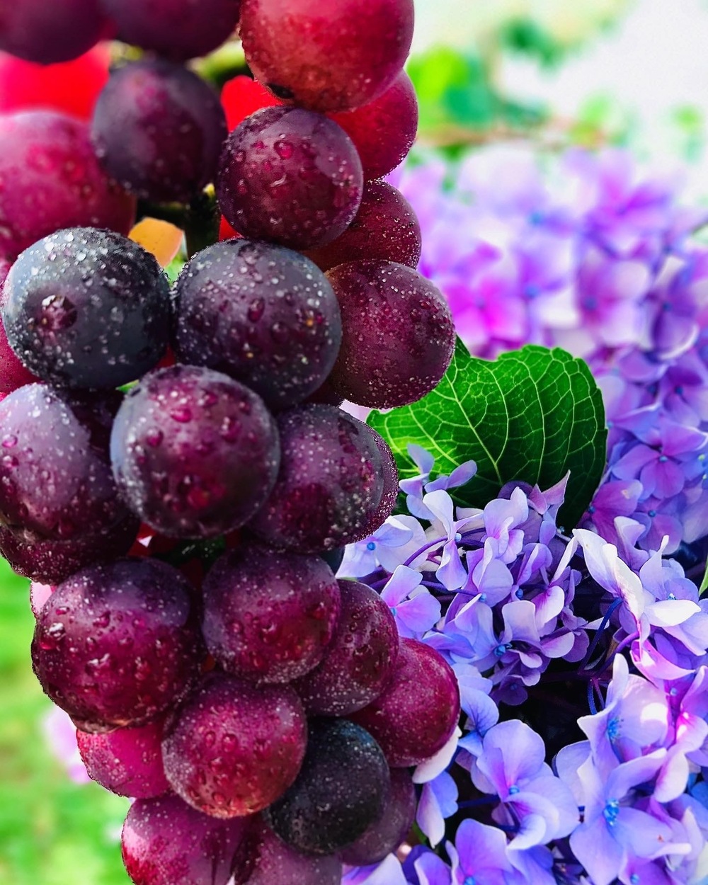ぶどうと紫陽花の素敵なコラボですね✨朝露に濡れたぶどうと紫陽花のどちらも鮮やかな色がキレイです😄
