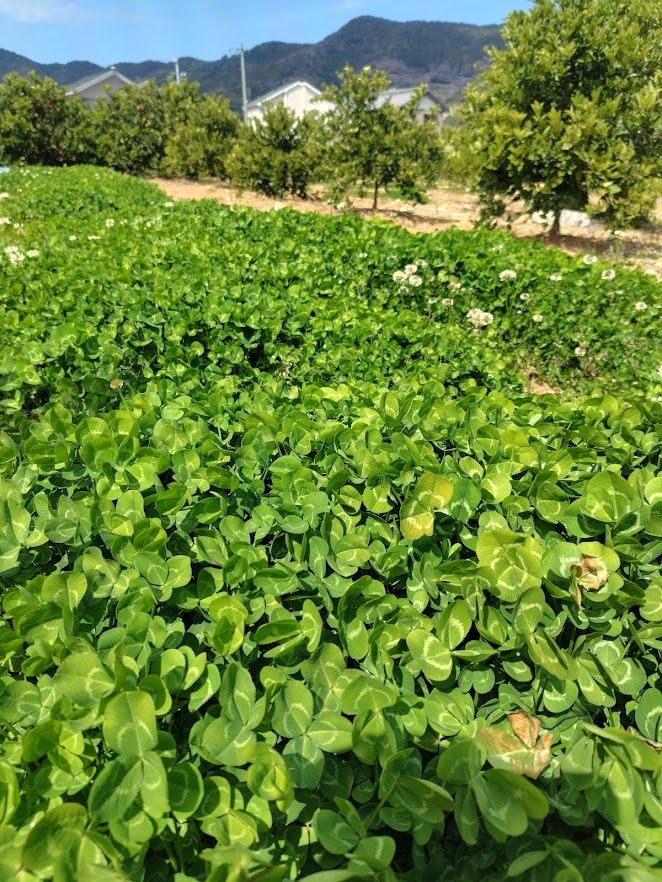 我が家では一部の畑でクローバー☘の草生栽培を行っています。見つけました。何と葉が6枚のクローバー☘。(下の写真では5枚に見えますが、よく見ると中央付近に1枚が少しだけ顔を出しています。)