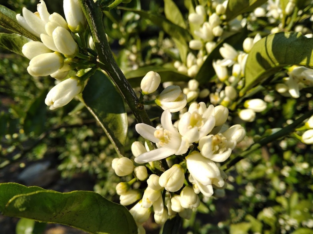 みかんの花はどれも5枚の花弁をもっています。品種によって花弁の厚さや大きさは異なります。早生みかんに比べてポメロや甘夏みかんの花は大きいです。どれも純白でとってもいい香りがします。