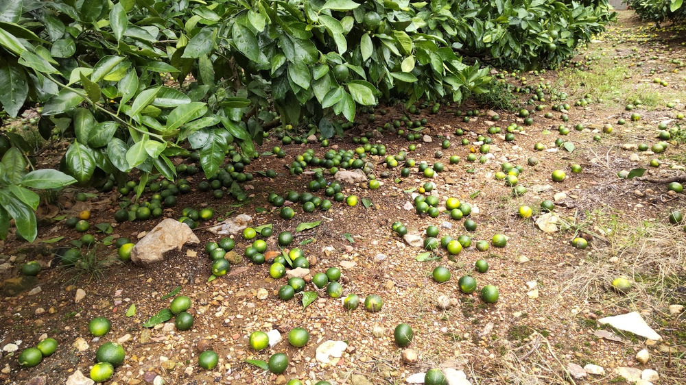 9月になり、仕上げ摘果の時期となりました。相変わらず「テデトール」の摘果作業です。仕上げ摘果では、サイズを揃えることと傷果を落とすことが中心になります。葉陰で遠慮しながら育って大きくなれなかったみかん、パワーが有り余って肥大し過ぎたみかん、風雨を正面に受けて仲間を守り傷を負ったみかん、病害虫に狙われて健康を損ねたみかんたちです。その子たちは、これまで幾多の試練を乗り越えてここまでがんばって育ってきたみかんです。収穫期が遠くに見えてきた今、本懐を遂げることなく地面に転がされ、さぞ悔しい想いで空を仰いでいることと思います。(ごめんね。来年に期待だよ。)