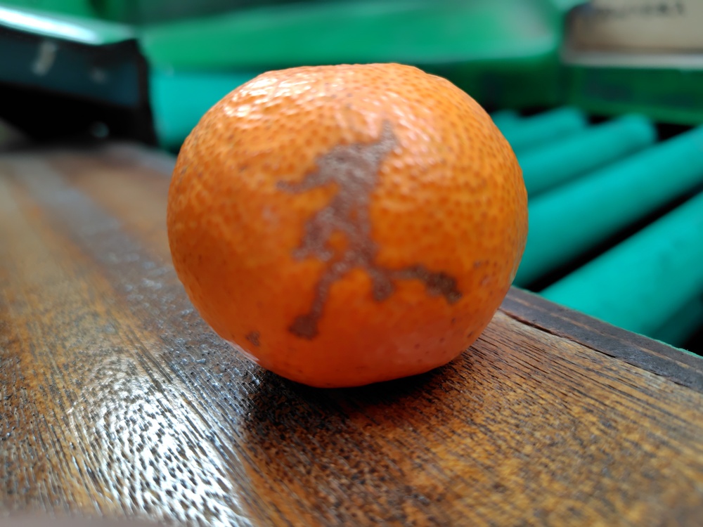 みかん界でもタトゥーが流行っているのかと思いきや、そうではありません。彼らはみかん界の「ならず者」でもありません。本当は夏の猛烈な暑さや幾多の雨風を乗り越えてがんばってきたみかん界のヒーローです。こつぶちゃんたちのことも可愛がる心優しいヒーローです。無数の傷を負いながらも必死になって中身の果実を完熟まで守り続け、今やっと本懐を遂げようとしています。