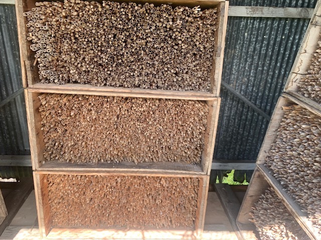 写真④ 受粉用の「まめこ蜂」の巣箱ですが、
