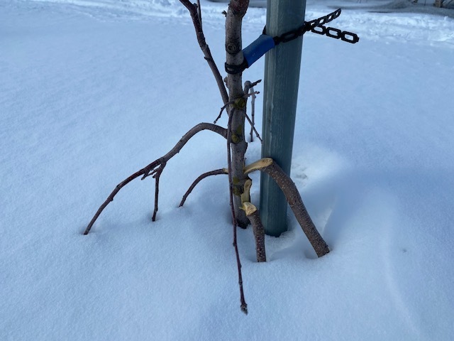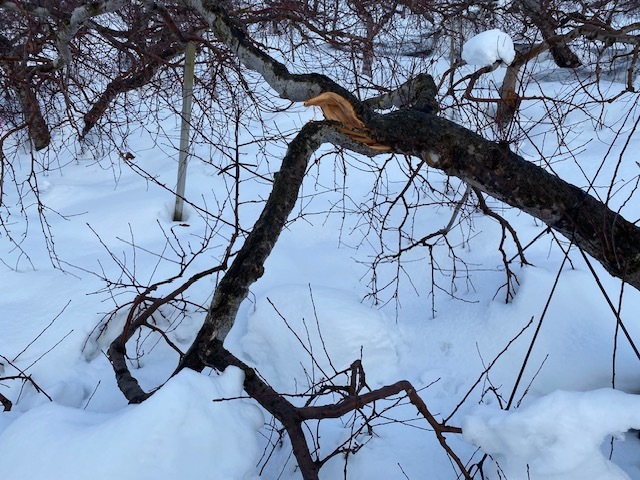 融雪の際に枝が、下に引っ張られるため、枝折れ・幹裂傷が発生します。