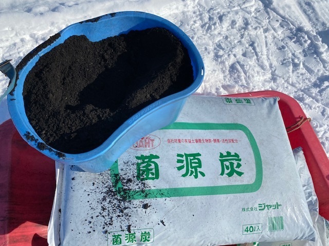 弊園では消雪剤(炭の粉)を散布したので、上からの太陽熱吸収と下からの地熱の相乗効果で、3月末頃の消雪を目標にしております。