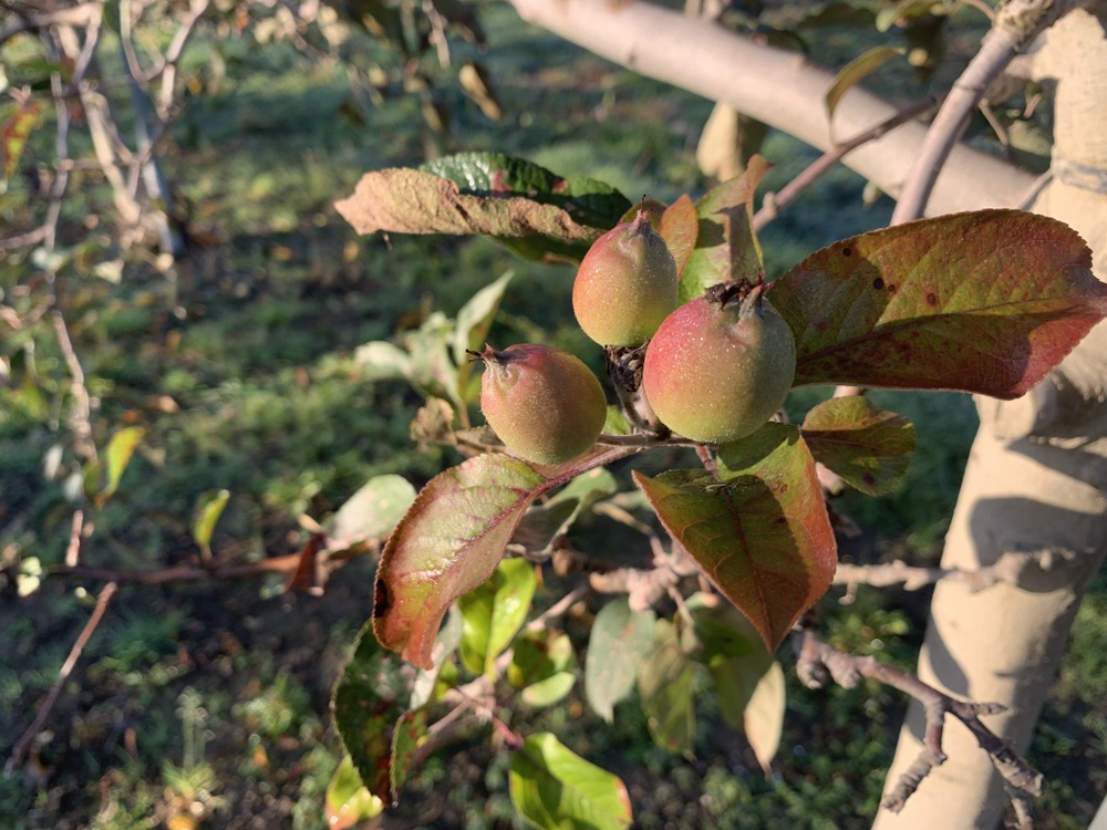 八月の大雨災害で葉っぱが枯れ落ち、春と勘違いして花が咲き、実を結び、りんご樹の生態系が崩れており、来春以降の生育が心配されます。