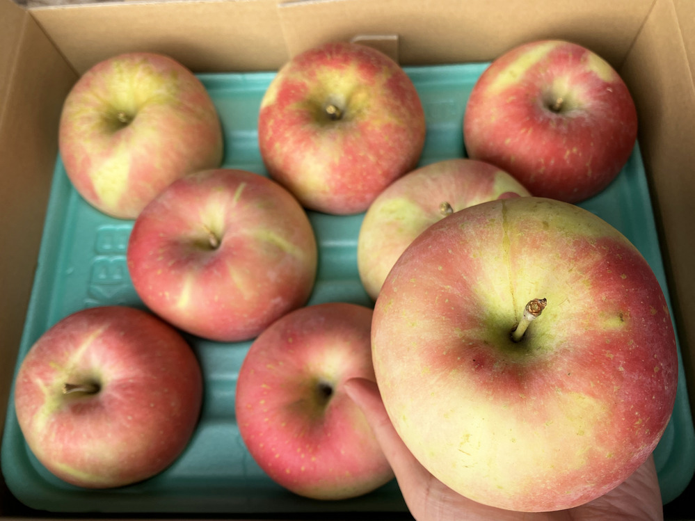 今年は猛暑の影響で、赤く色づく前に食べごろを迎えるりんごが多く、全体的に色が薄い傾向にありますが、食感や鮮度を重視して収穫をしております!!