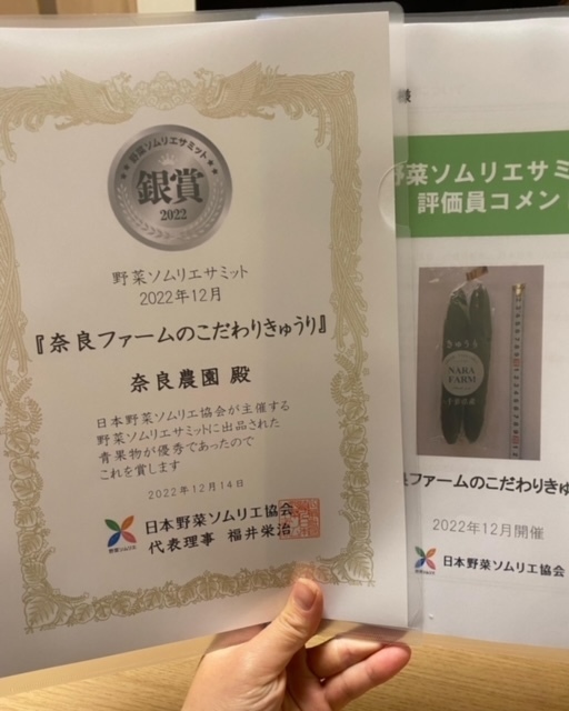 先日行われた野菜ソムリエサミットにおいて、こだわりきゅうりが銀賞を受賞しました!