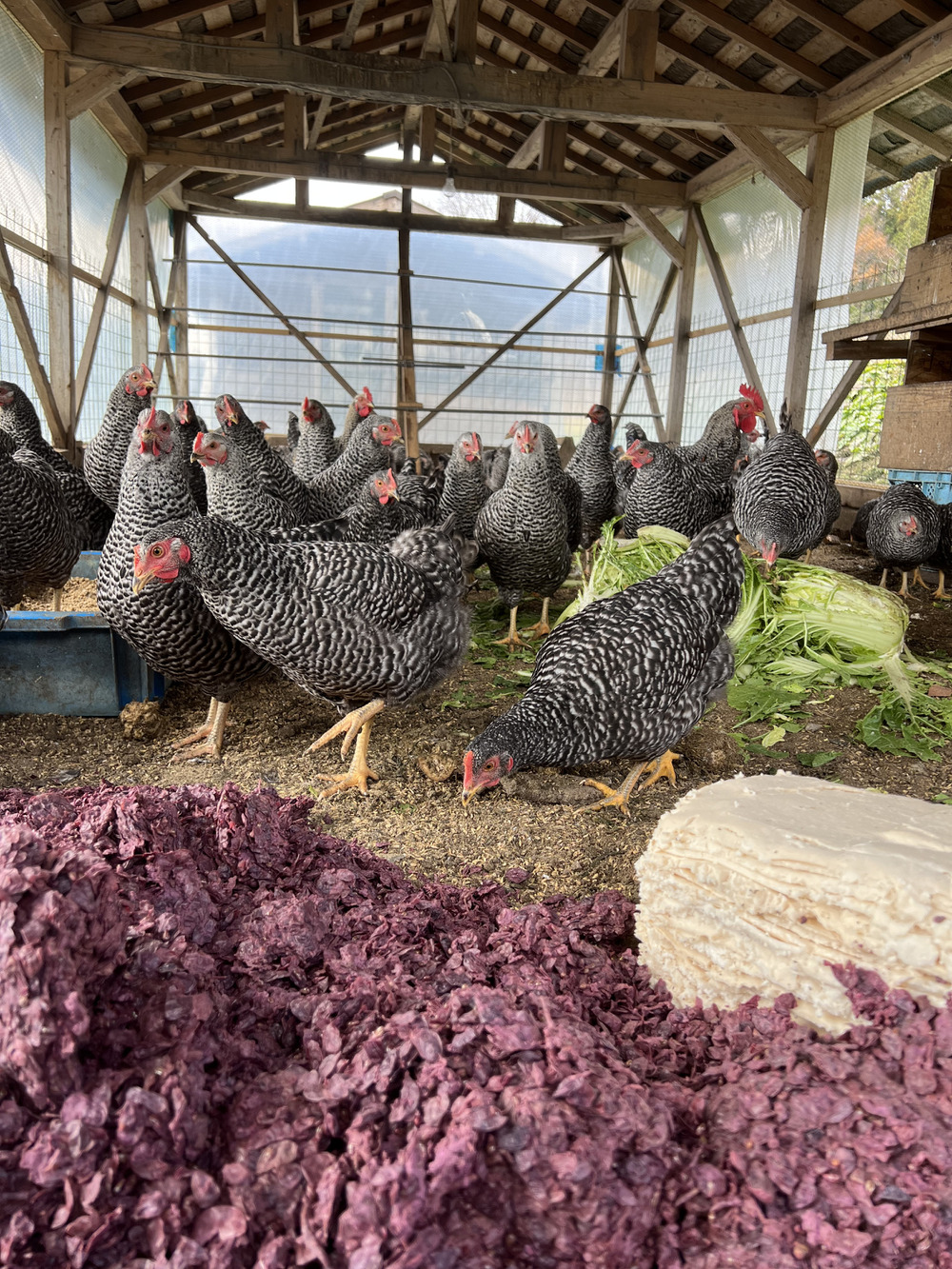 併せて町内ワイナリーさんよりワイン粕も頂いて、鶏舎の中はカラフル&良い香り