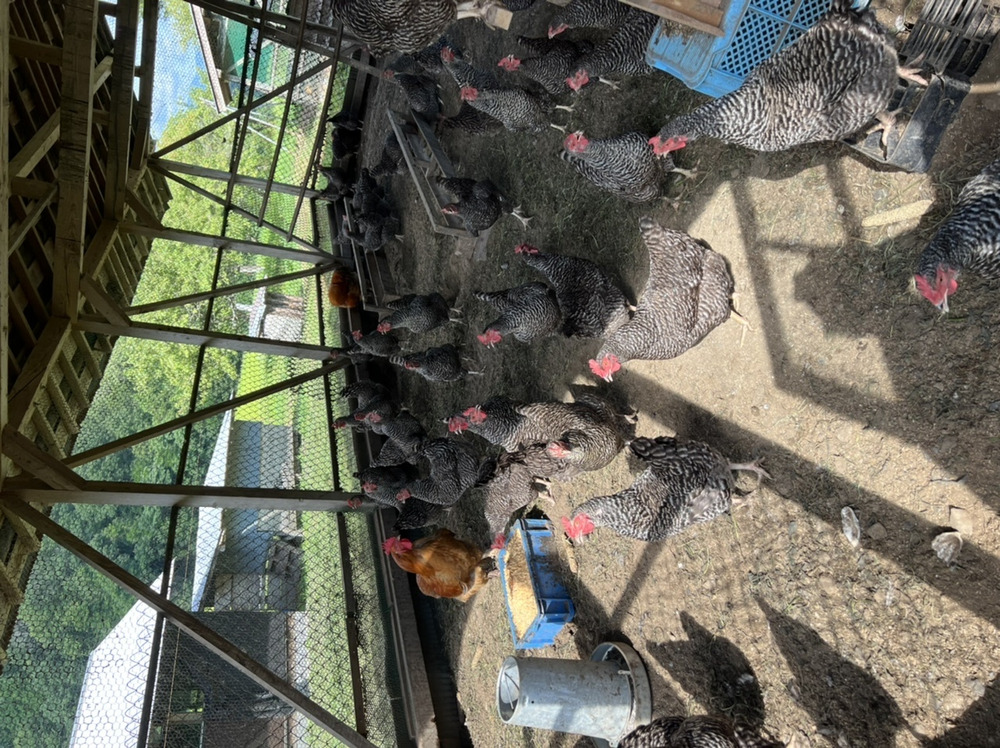 この形状の鶏舎は飼育管理する上ではかなり効率が悪いのですが、お陰で鶏達暑い中でも元気に卵を産んでくれてます