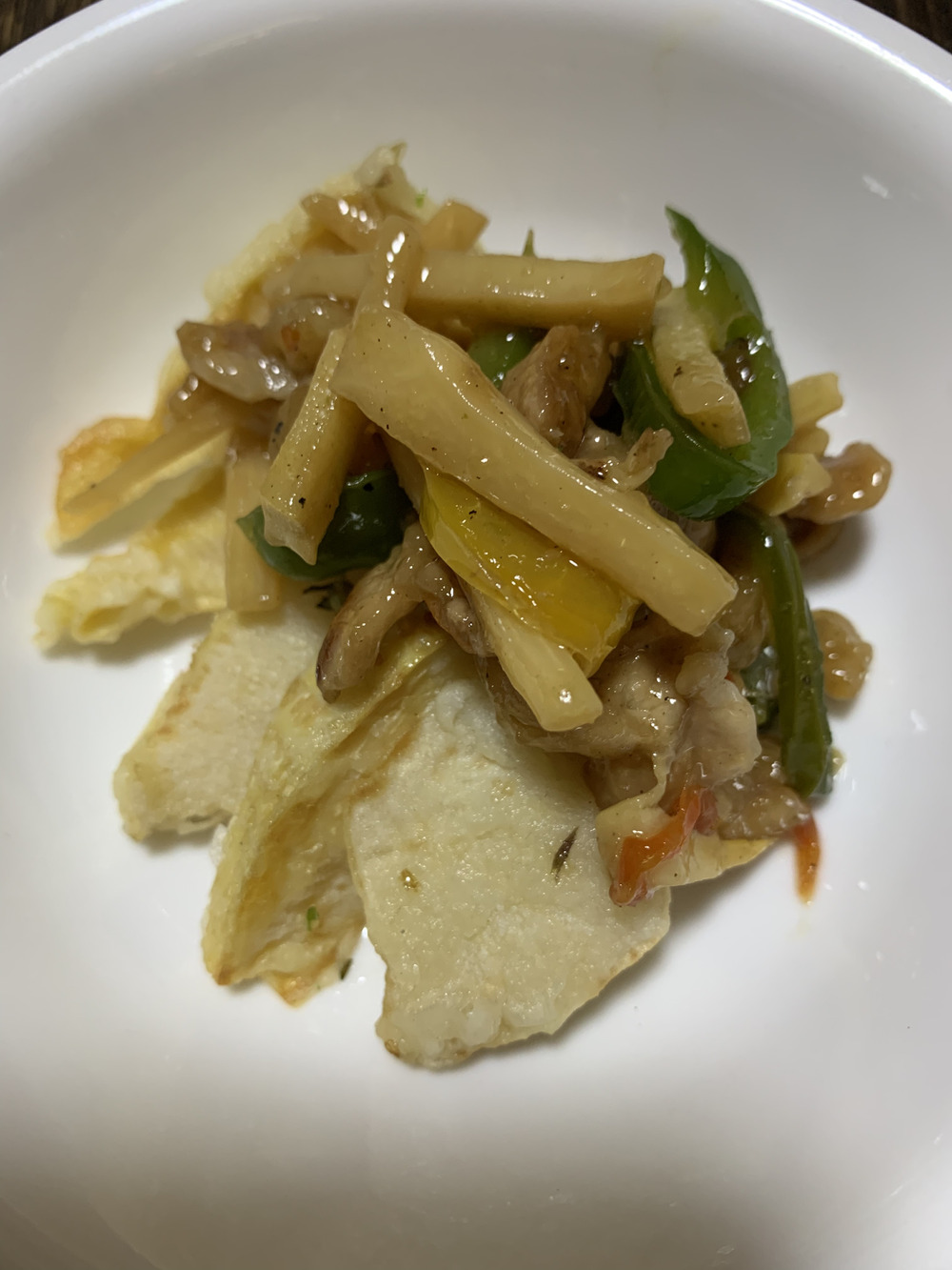 最高なのは、タケノコの天ぷらに青椒肉絲をかけたもの。
