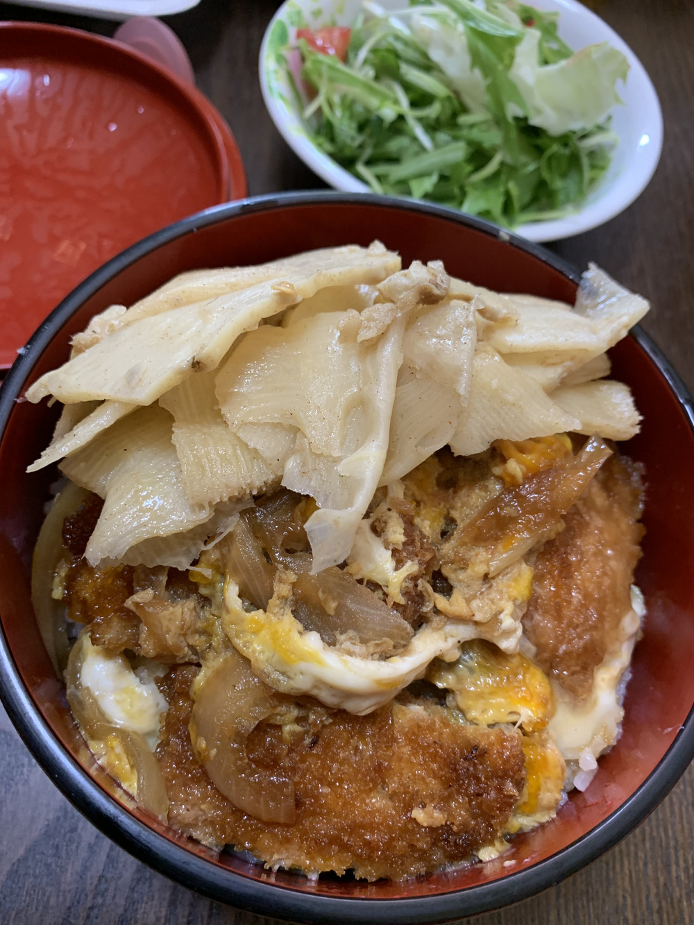 出前カツ丼にタケノコを乗せると美味しくなる。