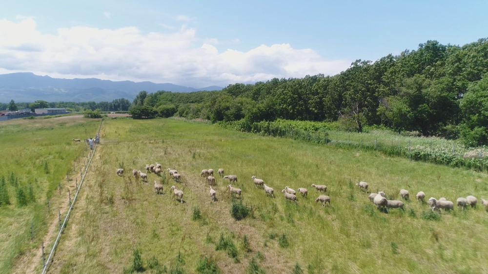 わずか2ヘクタールしかない牧場です。ドローンから見ると、日本海が見えるんですね。