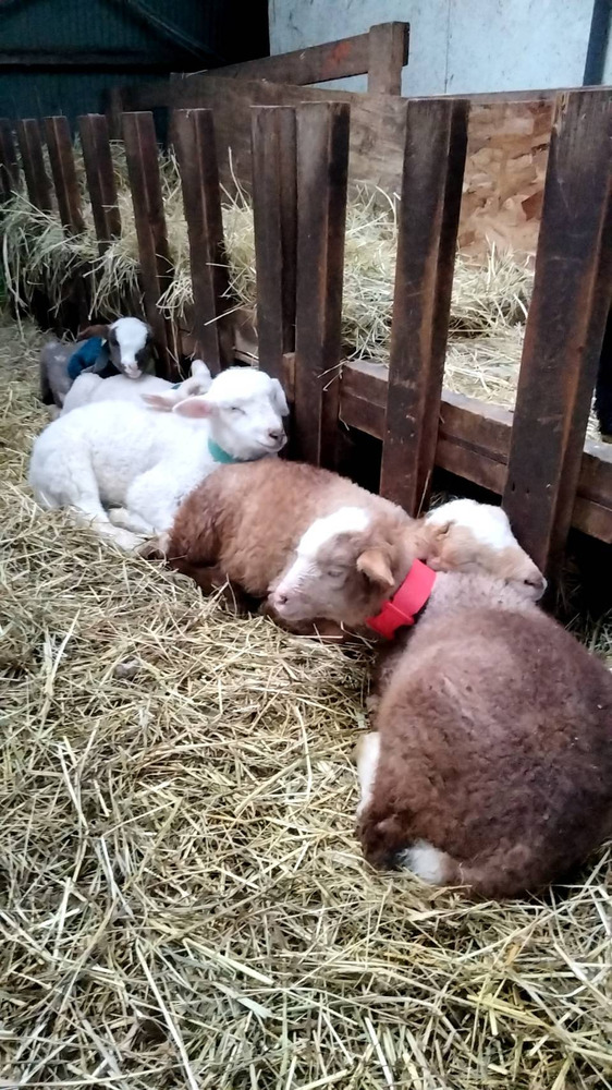 自動哺乳機の乳首に仔羊が一頭も吸っていないので、どこいったのかなぁー?と、畜舎内を探すと、…居ましたーー。