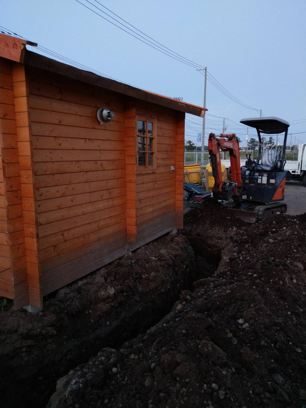 残りの工事は、上下水道の整備で、今日は水道管の地下埋設の為に重機をレンタルして、1m掘りました。