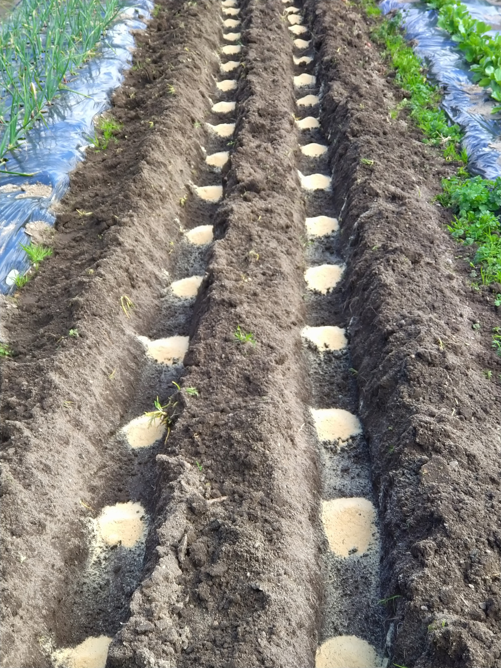 溝を掘って、種芋と米ぬかを交互に置いています。