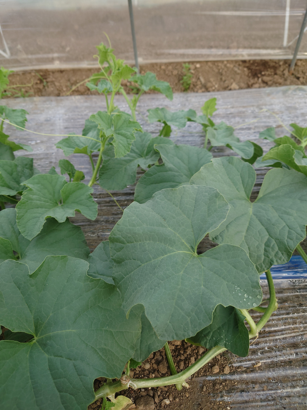 片手に乗るサイズだった1ヶ月前の苗の時期が嘘のように、今ではトンネルいっぱいに体を伸ばしています。