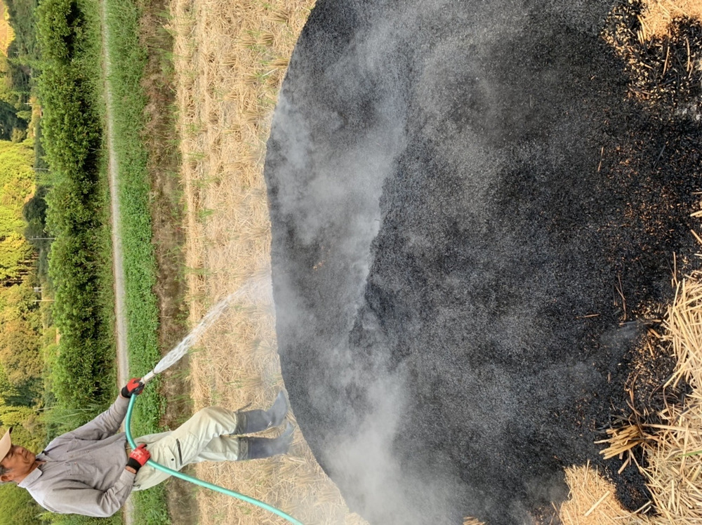 でっ、大量に出た籾殻。ほとんどは田んぼに返してすき込むんだけど、農家の特権❣️くん炭を大量に作りました😤