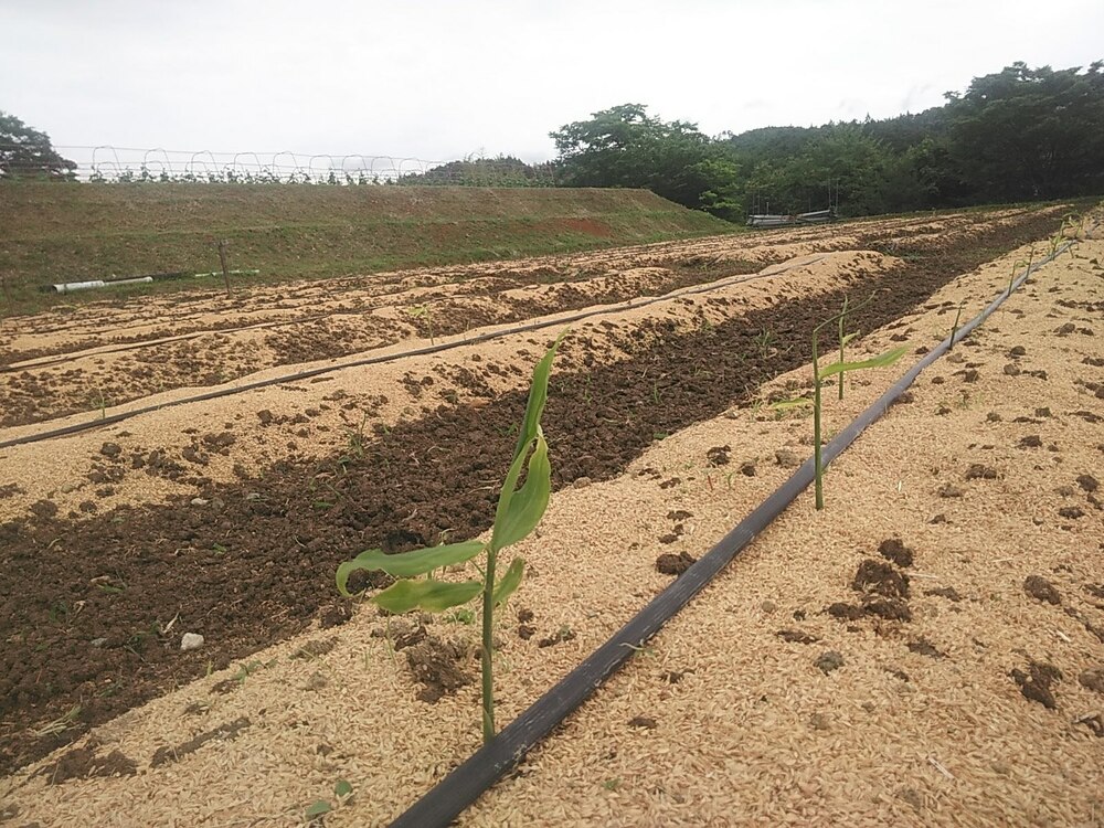 黄金生姜の芽が伸びたので、土寄せ出来るようにマルチを外し籾殻で代用。