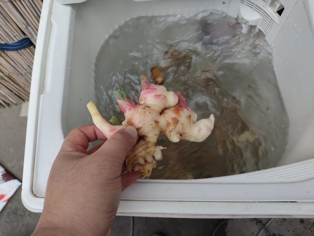 飲食店様でサンプルがほしいとのことで少し早いのですが3キロほど生姜を収穫。昨年苦労した洗浄を今年は洗濯機でやってみました。😀