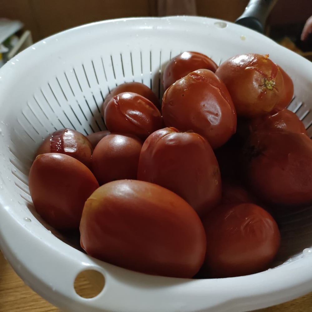 トマトの皮むきは、湯むきより冷凍したトマトを使うと簡単です。水で流すだけで簡単にむけます。