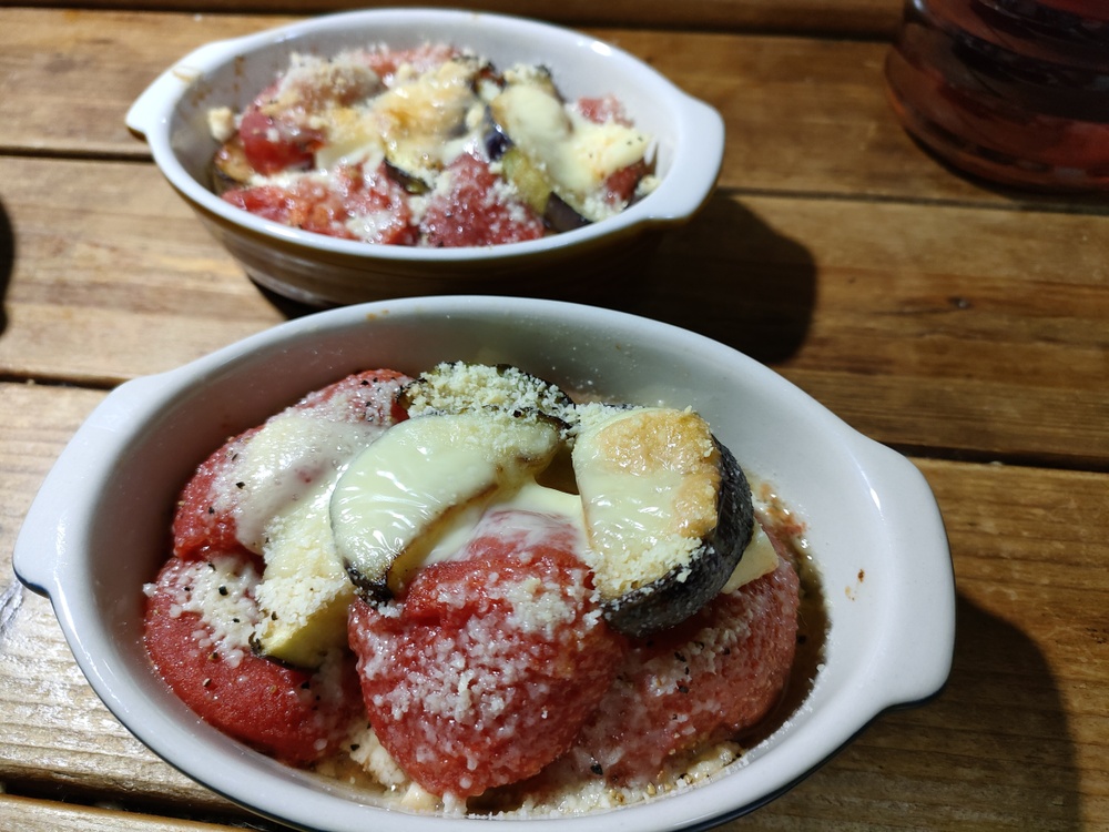 すずこまトマトを湯むきして、ナス、チーズと焼いた料理です。