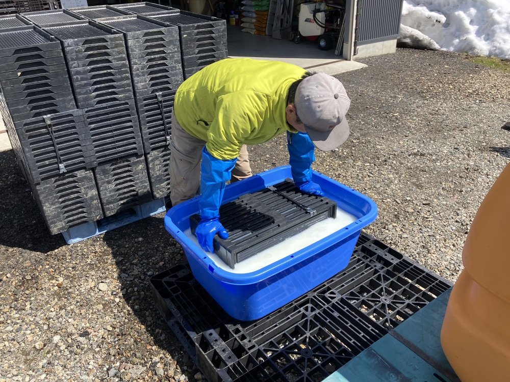 苗箱の消毒をしました。最近春の気温が高く苗の高温障害が心配なためより慎重に管理して行きます!