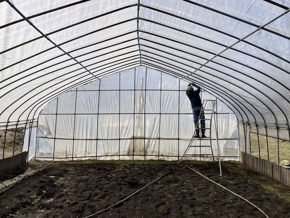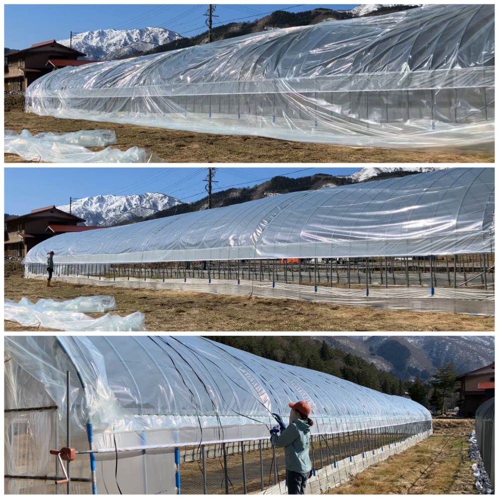 薄いビニールですが長いのでなかなかの重さです。朝10時頃から風が吹き始めるのでそれまでに張れるよう段取りしています😃無事完成して一安心です。