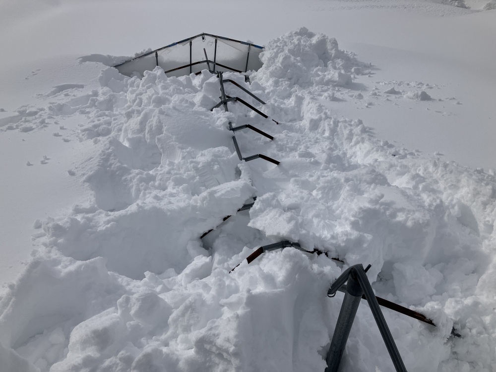 倉庫の雪囲いをしました。すでに屋根雪が落ちる通路は1メートルほどの積雪です⛄️