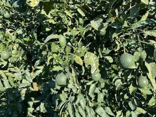 みかんもおしろいを塗る時期になりました。何故このようなことをするかと言えば、夏の暑さによるみかんの日焼けを軽減するためにホワイトコートという炭酸カルシウムの粉末を希釈して散布します。