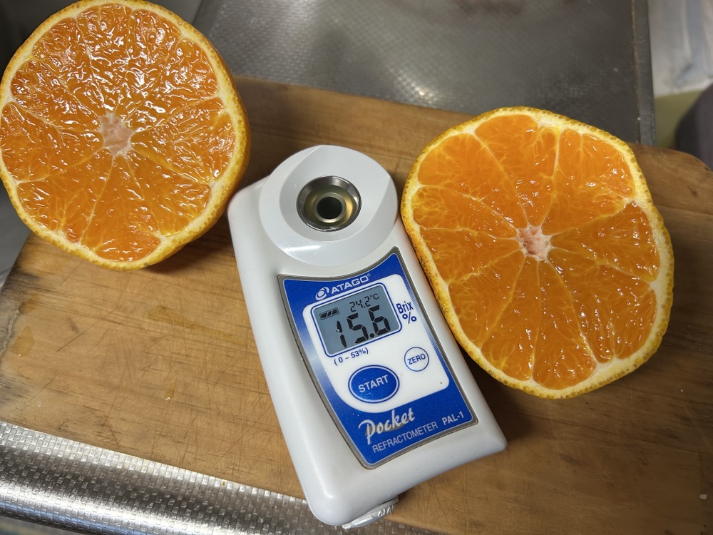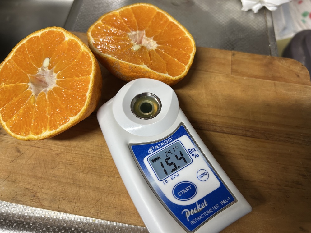 写真は今朝測定したものです。果皮色からそこまで糖度は高くなさそうなものを選んだものです。
